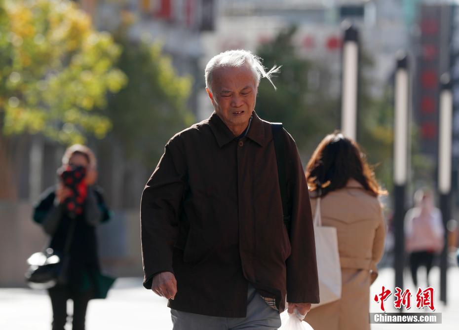 10月26日,北京王府井步行街,一名老者在风中出行。中国天气网发布消息称,北京当日北风四五级,阵风七级左右,大风蓝色预警持续。中新社记者 刘关关 摄
