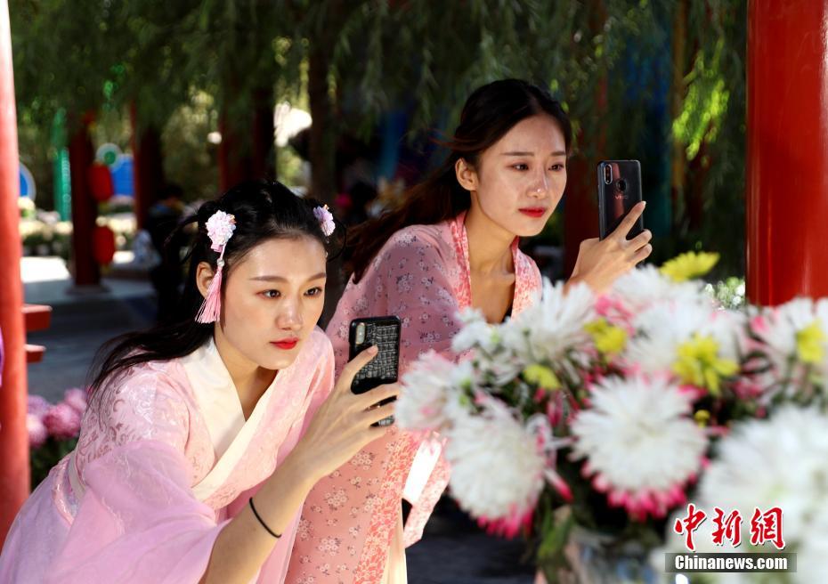 10月26日,河南开封清明上河园游人如织,民众身着宋装观赏菊花。据介绍,开封第36届菊花文化节举办时间是10月18日至11月18日,历时一个月,清明上河园景区启动万套宋装免费穿活动,为游客免费提供了上万套宋装供游客穿宋装赏菊花,感受菊香宋韵。本届菊花文化节期间,开封市共布展菊花279万盆。其中开封清明上河园景区的国际菊花展共有来自全世界15个国家、近千个品种的菊花。中新社记者 王中举 摄