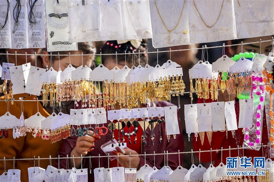 10月28日,人们在新疆巴楚县巴楚镇的“周日巴扎”上选购饰品。