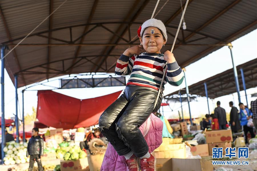 10月28日,一名小朋友在新疆巴楚县巴楚镇的“周日巴扎”蔬菜交易区“荡秋千”。