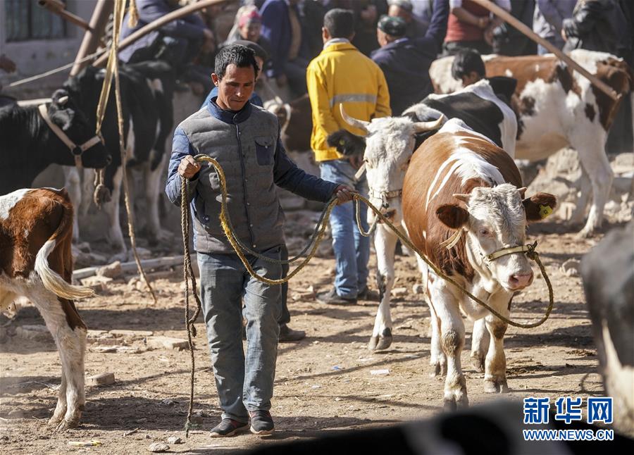 10月28日,商贩牵着牛走在新疆巴楚县巴楚镇“周日巴扎”的牲畜交易区。