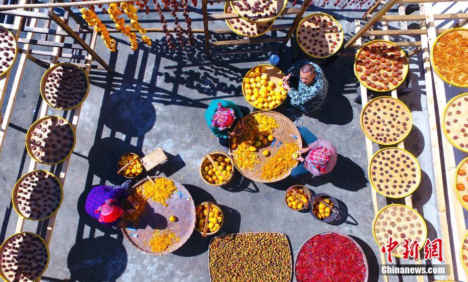 当地农民正在晾晒柿子、辣椒、玉米等五彩缤纷的丰收成果。刘占昆 摄