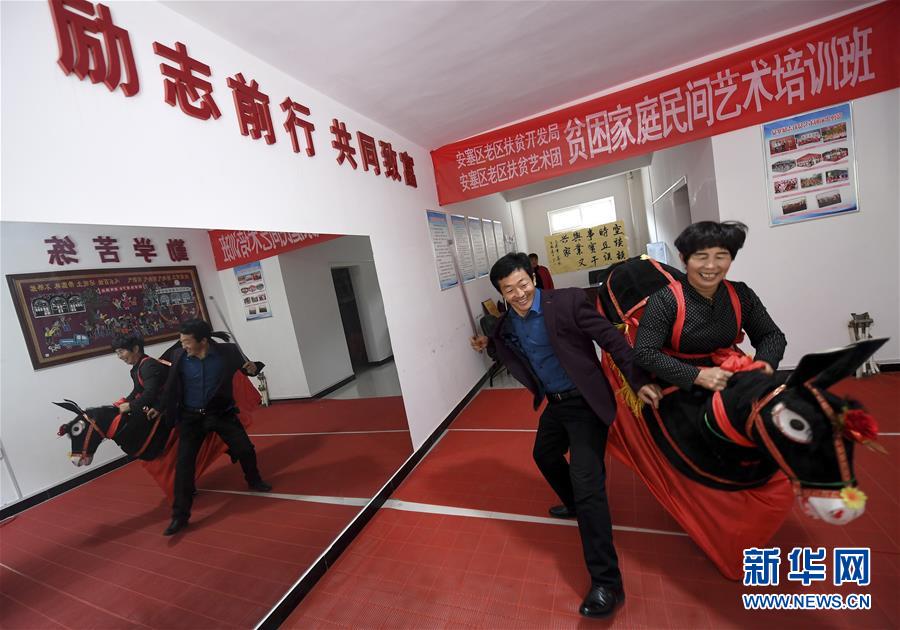 搬迁入住安塞区城北社区的贫困户李成红、申爱珍(右)在社区民间艺术培训班学习。(10月19日摄)。 位于黄土高原腹地的陕西省延安市安塞区,是拥有“腰鼓之乡”“剪纸之乡”“绘画之乡”“民歌之乡”和“曲艺之乡”五张文化名片的县区,也是“国家级文化产业示范基地”和“中国民间文化艺术之乡”。 近年来,当地政府因势利导,按照“文化输出、旅游导入”和“文化养民、文化富民”思路,把文化旅游发展同文化旅游扶贫统筹推进。全区免费为贫困群众举办各类艺术培训班,让有劳动能力的贫困群众掌握文化技能,利用闲暇时间参加文化演出增加收入;依托当地演出公司和文化协会,组织全区文化艺术人才赴世界各地巡回演出,让文化走出去、游客走进来。 新华社记者刘潇摄