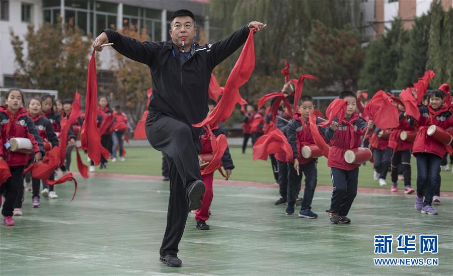 安塞区第二小学体育老师侯成龙(前)带领五年级学生练习安塞腰鼓(10月22日摄)。 位于黄土高原腹地的陕西省延安市安塞区,是拥有“腰鼓之乡”“剪纸之乡”“绘画之乡”“民歌之乡”和“曲艺之乡”五张文化名片的县区,也是“国家级文化产业示范基地”和“中国民间文化艺术之乡”。 近年来,当地政府因势利导,按照“文化输出、旅游导入”和“文化养民、文化富民”思路,把文化旅游发展同文化旅游扶贫统筹推进。全区免费为贫困群众举办各类艺术培训班,让有劳动能力的贫困群众掌握文化技能,利用闲暇时间参加文化演出增加收入;依托当地演出公司和文化协会,组织全区文化艺术人才赴世界各地巡回演出,让文化走出去、游客走进来。 新华社记者陶明摄