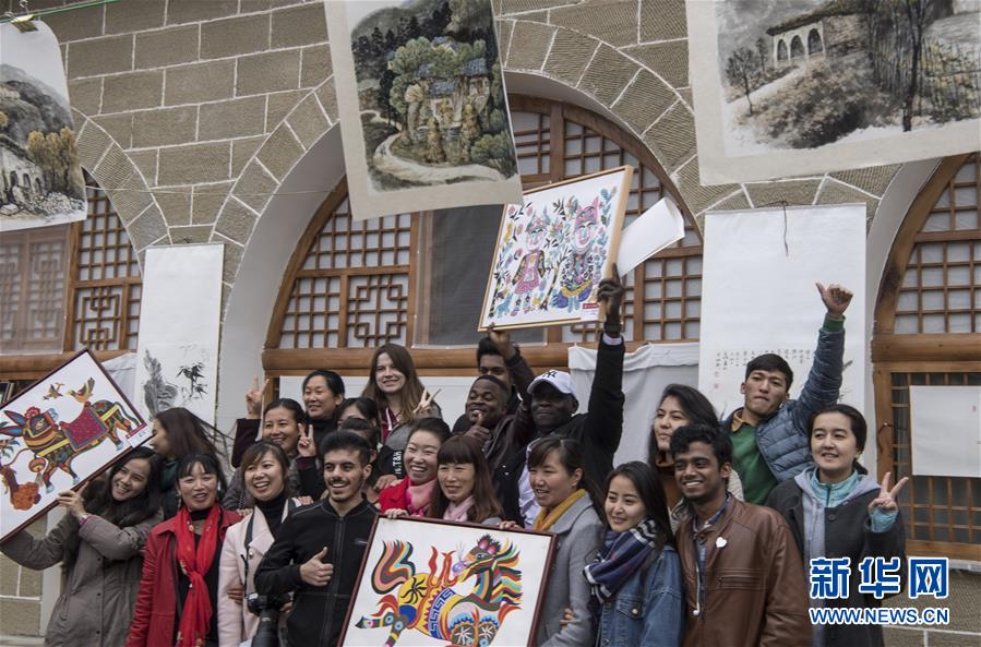 在安塞区高桥镇魏塔“东方毕加索”绘画村,来自“一带一路”沿线国家的留学生与当地民间艺人一起交流绘画技艺并合影留念(10月20日摄)。 位于黄土高原腹地的陕西省延安市安塞区,是拥有“腰鼓之乡”“剪纸之乡”“绘画之乡”“民歌之乡”和“曲艺之乡”五张文化名片的县区,也是“国家级文化产业示范基地”和“中国民间文化艺术之乡”。 近年来,当地政府因势利导,按照“文化输出、旅游导入”和“文化养民、文化富民”思路,把文化旅游发展同文化旅游扶贫统筹推进。全区免费为贫困群众举办各类艺术培训班,让有劳动能力的贫困群众掌握文化技能,利用闲暇时间参加文化演出增加收入;依托当地演出公司和文化协会,组织全区文化艺术人才赴世界各地巡回演出,让文化走出去、游客走进来。 新华社记者陶明摄