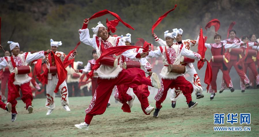 在冯家营“千人腰鼓”文化表演村,村民们在表演安塞腰鼓(10月19日摄)。 位于黄土高原腹地的陕西省延安市安塞区,是拥有“腰鼓之乡”“剪纸之乡”“绘画之乡”“民歌之乡”和“曲艺之乡”五张文化名片的县区,也是“国家级文化产业示范基地”和“中国民间文化艺术之乡”。 近年来,当地政府因势利导,按照“文化输出、旅游导入”和“文化养民、文化富民”思路,把文化旅游发展同文化旅游扶贫统筹推进。全区免费为贫困群众举办各类艺术培训班,让有劳动能力的贫困群众掌握文化技能,利用闲暇时间参加文化演出增加收入;依托当地演出公司和文化协会,组织全区文化艺术人才赴世界各地巡回演出,让文化走出去、游客走进来。 新华社记者陶明摄