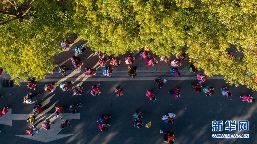 孩子们在安徽合肥滨湖国家森林公园内秋游(10月29日无人机拍摄)。 新华社记者 郭晨 摄