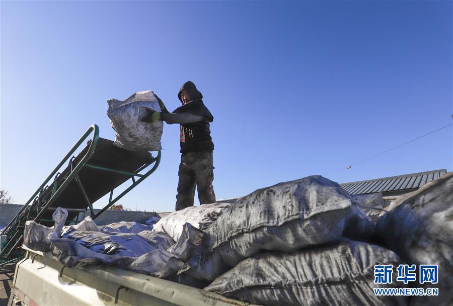 10月29日,在河北唐山遵化市一家新型环保民用煤生产企业,工人在运送环保民用煤。 新华社发(刘满仓 摄)
