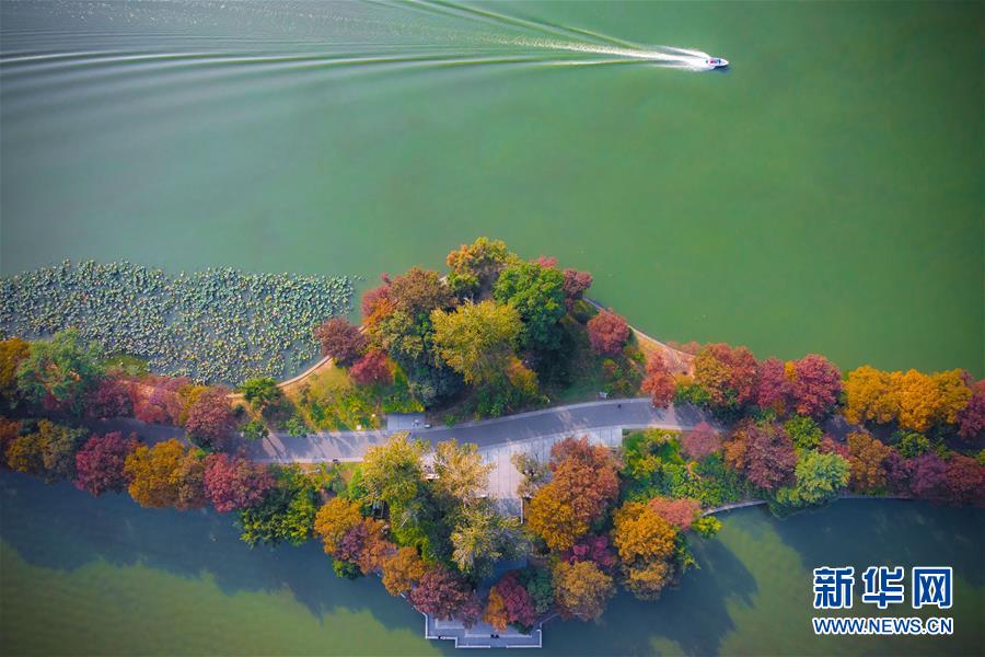 这是南京玄武湖景区秋景(10月30日无人机拍摄)。 金秋时节,神州大地层林尽染,美不胜收。 新华社发(苏阳 摄)