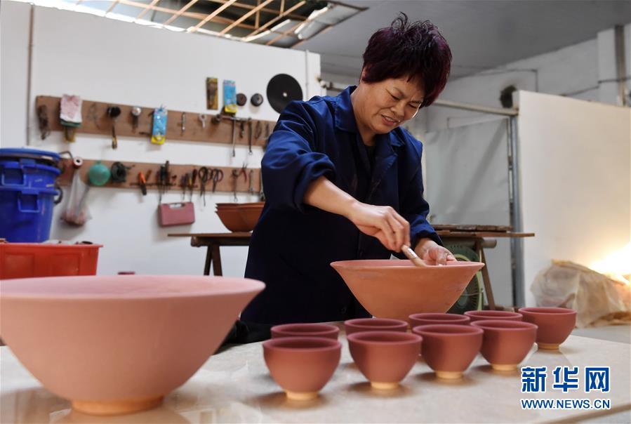 10月29日,建阳建盏传统技艺传承人李细妹在给建盏坯体上釉。