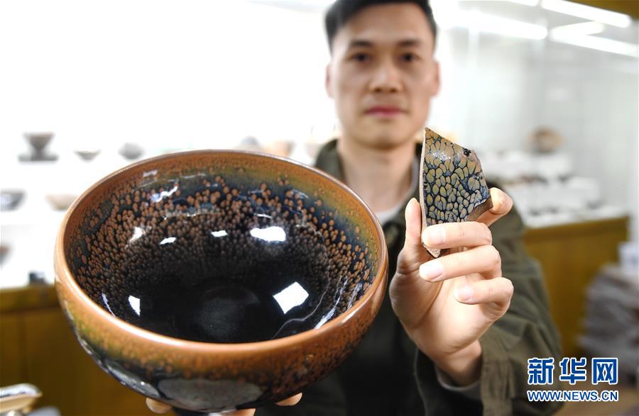 10月29日,建阳建盏传统技艺传承人周建平在展示他烧制的鹧鸪斑建盏(左)和宋代鹧鸪斑建盏碎片。