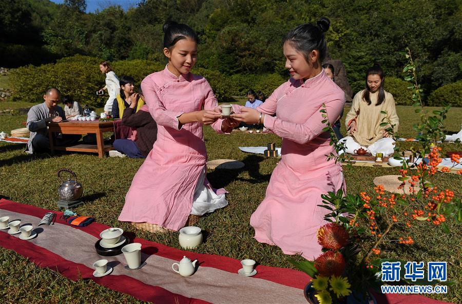 金秋时节,身着古朴服饰的福建武夷山茶人在户外摆茶席,在空气清新的大自然里感受茶文化。