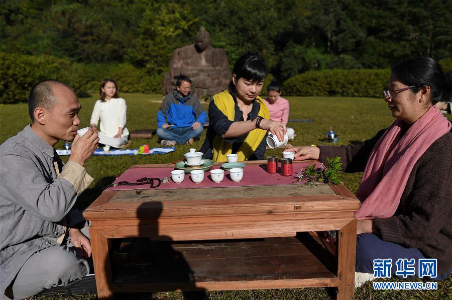 金秋时节,身着古朴服饰的福建武夷山茶人在户外摆茶席,在空气清新的大自然里感受茶文化。