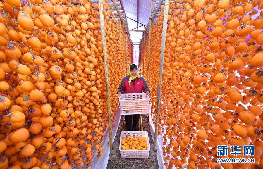 11月1日,山东省淄博市沂源县悦庄镇陈家官庄村的农民在搬运加工的柿子。 深秋时节,山东省沂源县的柿子迎来收获、加工季,当地农民趁着晴好天气,加紧将采摘的柿子进行选果、削皮、去蒂、吊晾等,并制成柿饼销往国内外,柿子加工是当地农民深秋增收的特色产业。 新华社发(赵东山 摄)