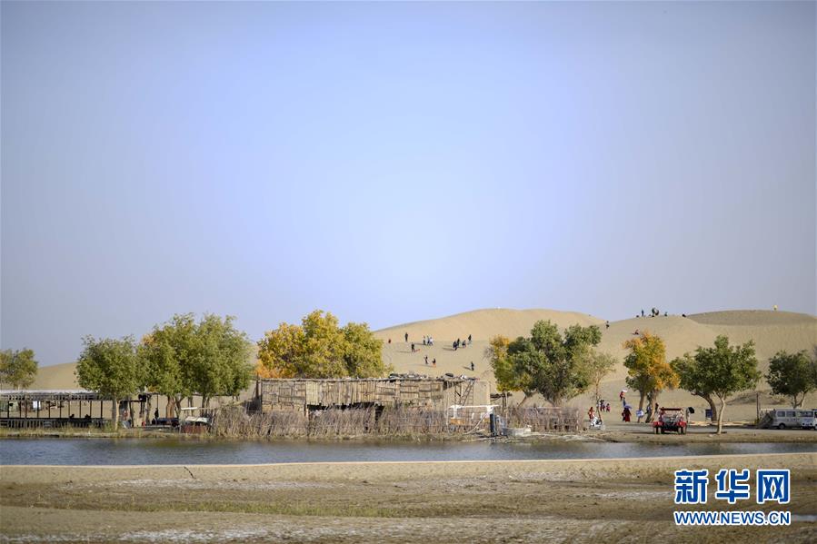 在位于新疆尉犁县的罗布人村寨里,游客在欣赏沙山水韵美景(10月16日摄)。新华社记者 赵戈 摄