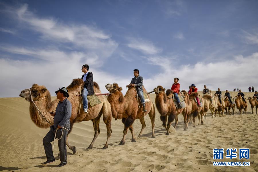 在位于新疆尉犁县的罗布人村寨里,游客骑着骆驼欣赏风景(10月16日摄)。新华社记者 赵戈 摄