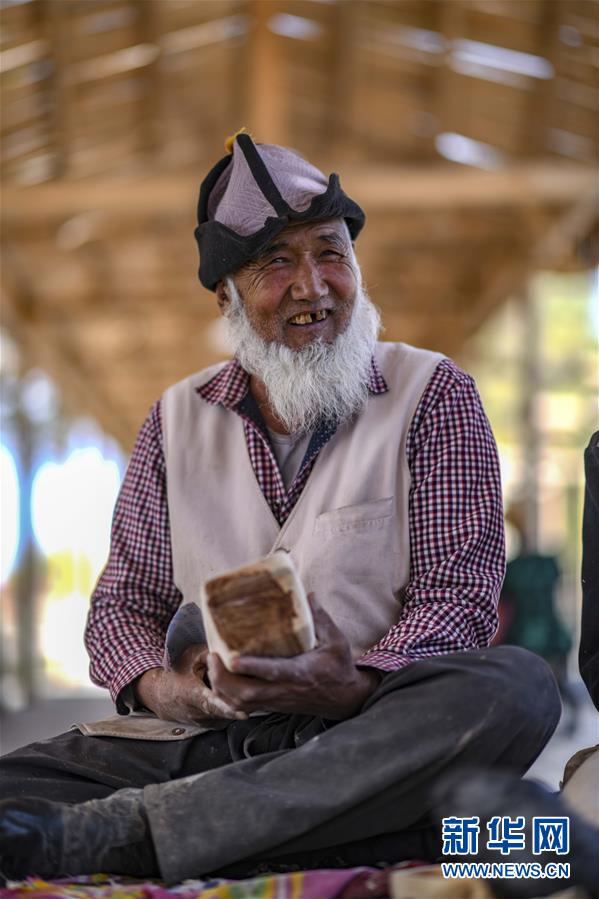 在新疆尉犁县,百岁罗布老人苏莱曼·托合提在制作卡盆模型(10月16日摄)。新华社记者 赵戈 摄