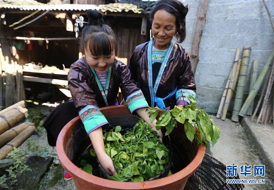 11月3日,在广西融水苗族自治县杆洞乡尧告村,村民在浸泡用于给布料染色的蓝靛草。 新华社发(石峰 摄)