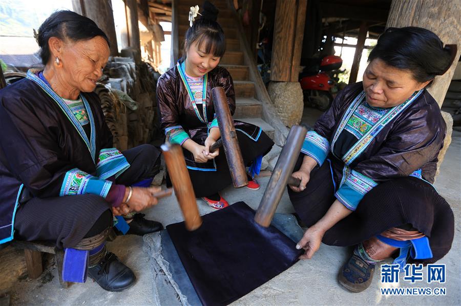 11月3日,在广西融水苗族自治县杆洞乡尧告村,村民用木槌捶打布料。 新华社发(石峰 摄)