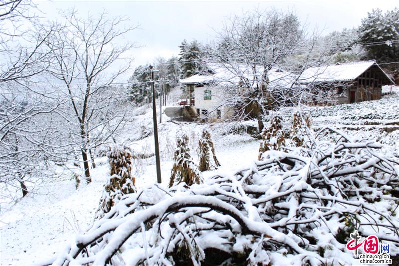 红叶与大雪齐飞 四川曾家山迎今冬第一场雪