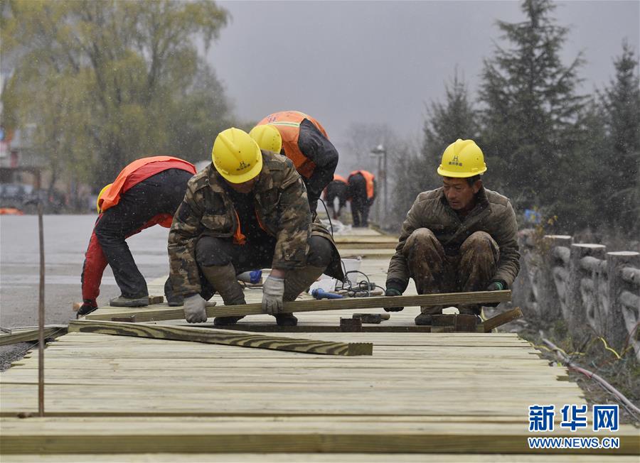 11月6日,工人们在九寨沟景区内架设栈道。 新华社记者 刘坤 摄