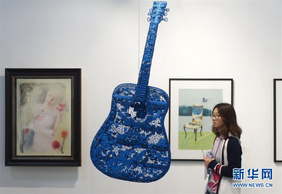 11月7日,一名观众在观看一把用不锈钢丝制作的“蓝色吉他” 。新华社记者 任珑 摄