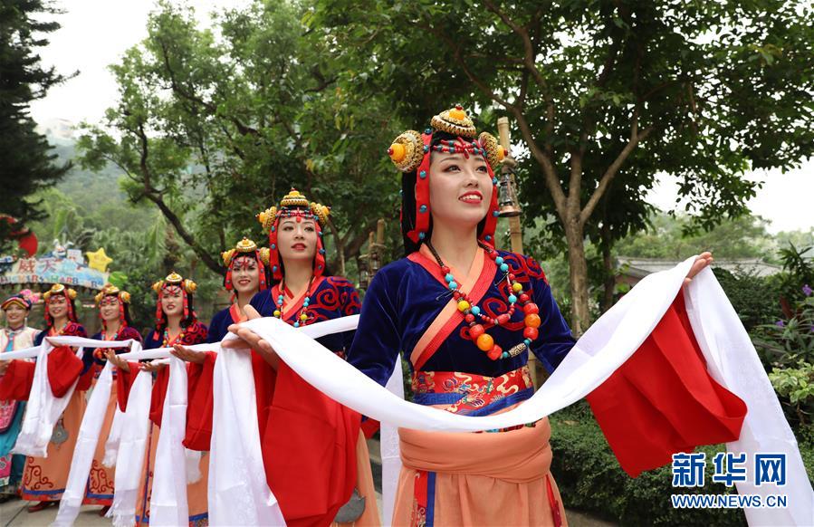 11月8日,来自四川阿坝州的青年在香港海洋公园歌舞迎宾。