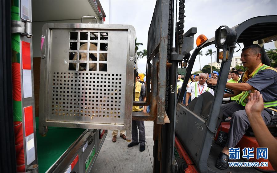 11月10日,在海口美兰国际机场,工作人员把大熊猫装车,准备运往海南热带野生动植物园。