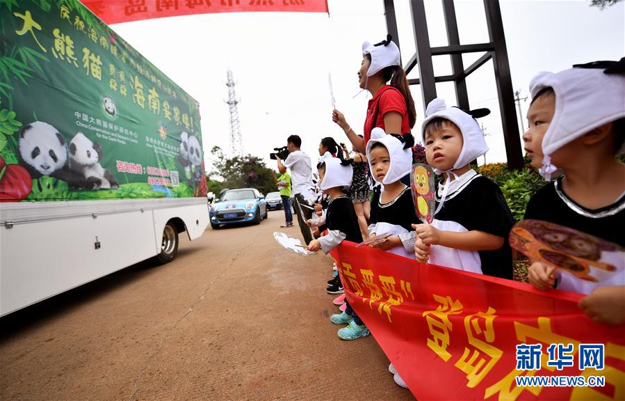 11月10日,小朋友们在海南热带野生动植物园迎接大熊猫的到来。