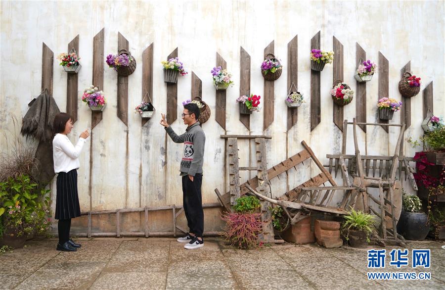 11月10日,游客在“梦里老家·演艺小镇”内留影。