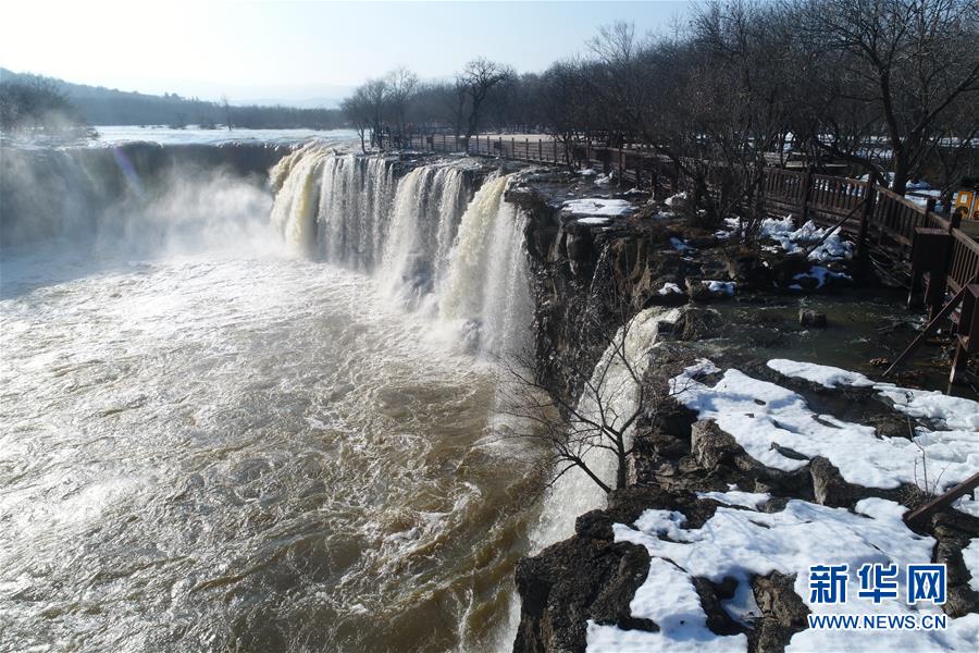 近日,黑龙江省牡丹江市镜泊湖世界地质公园内的吊水楼瀑布出现三面溢流大瀑布。大瀑布在白雪映衬下,飞流直下,雾气升腾,构成了初冬时节的独特景观。