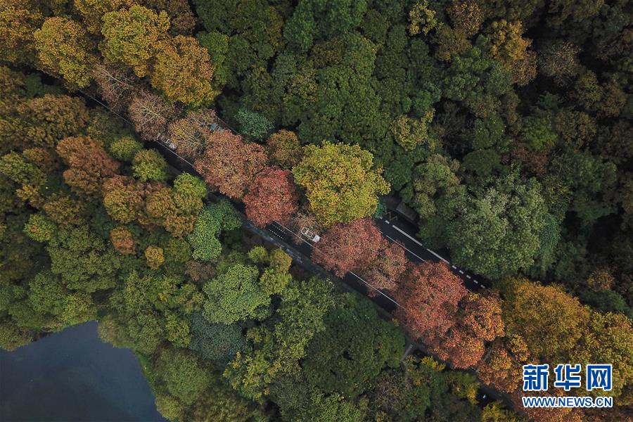 11月13日无人机拍摄的杭州西湖一景。 时值初冬,杭州市西湖景区层林尽染,色彩斑斓,别有一番韵味。