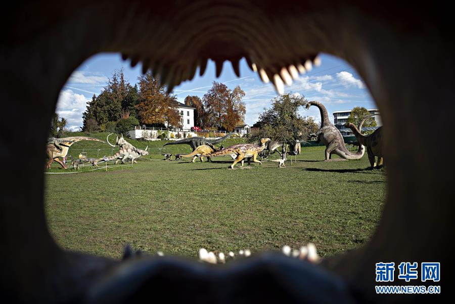 这是11月12日在瑞士苏黎世湖畔的拉珀斯维尔-约纳镇拍摄的恐龙模型。 霸王龙、三角龙、牛角龙、剑龙和异齿龙等60件恐龙模型在苏黎世湖畔的拉珀斯维尔-约纳镇展出,吸引大批当地居民和游客前来参观。 新华社发(米歇尔·立米纳摄)
