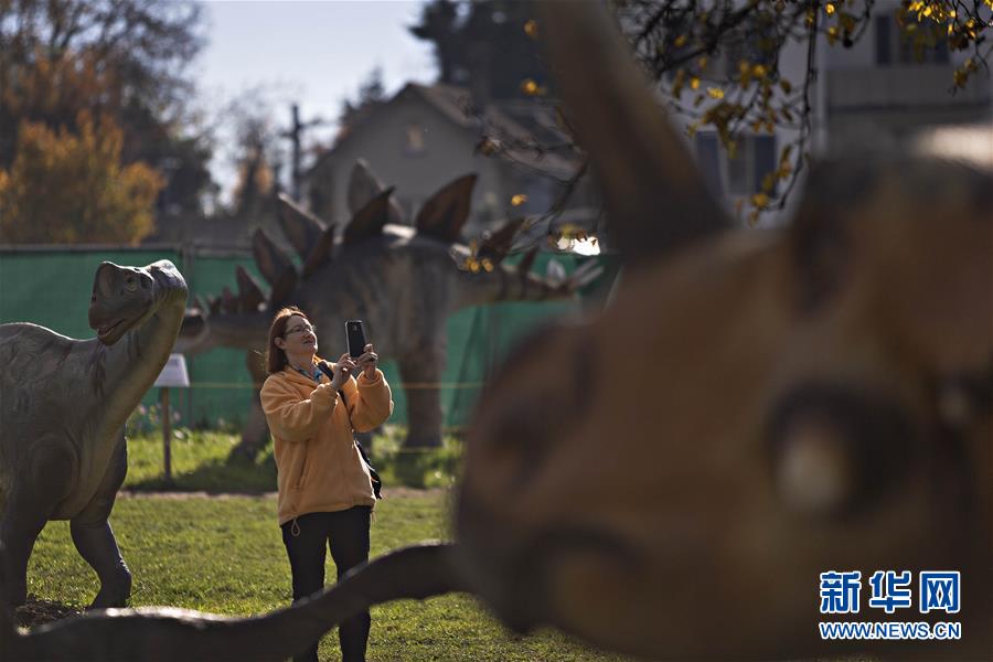 11月12日,在瑞士苏黎世湖畔的拉珀斯维尔-约纳镇,一名女子在恐龙模型展上拍照。 霸王龙、三角龙、牛角龙、剑龙和异齿龙等60件恐龙模型在苏黎世湖畔的拉珀斯维尔-约纳镇展出,吸引大批当地居民和游客前来参观。 新华社发(米歇尔·立米纳摄)
