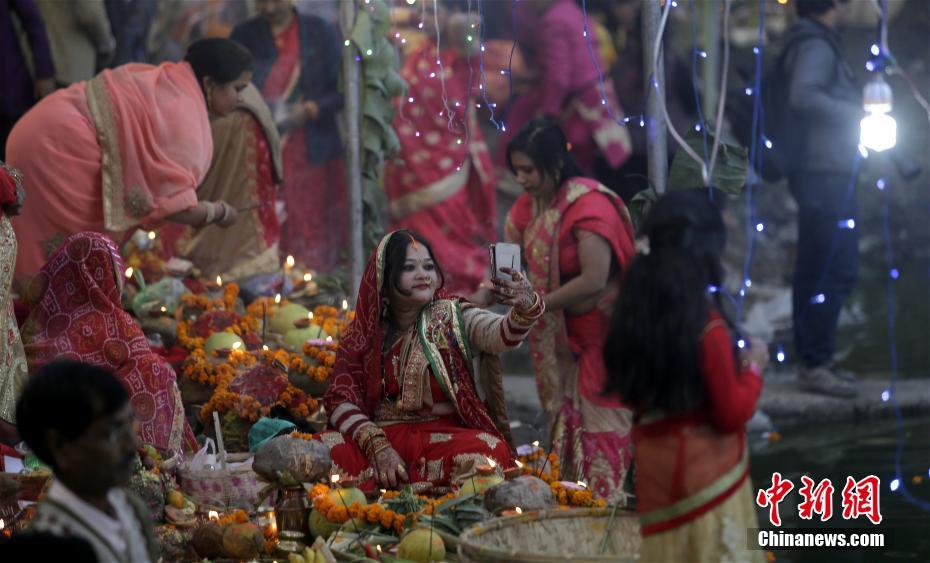 11月13日,尼泊尔太阳神节(Chhath Puja Festival),人们在日出和日落时到水域边,将祭品献给太阳神。图为尼泊尔加德满都一位女士在庆祝太阳神节的过程中自拍。中新社发 普拉丹 摄