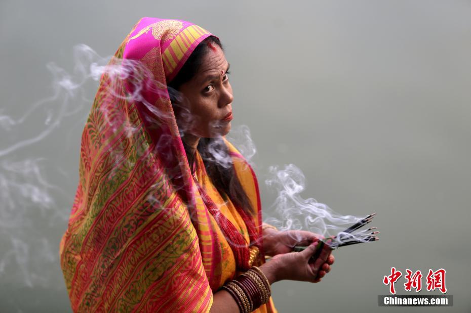 11月13日,尼泊尔太阳神节(Chhath Puja Festival),人们在日出和日落时到水域边,将祭品献给太阳神。中新社发 普拉丹 摄