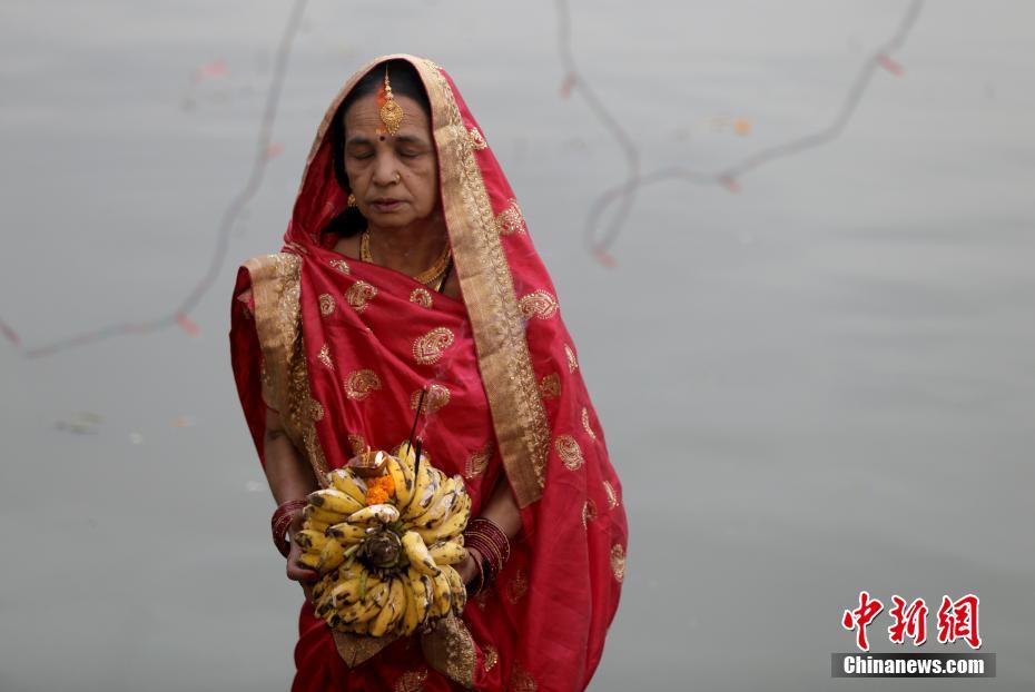 11月13日,尼泊尔太阳神节(Chhath Puja Festival),人们在日出和日落时到水域边,将祭品献给太阳神。图为一位妇女拿着香蕉在加德满都一河流边礼敬太阳神。中新社发 普拉丹 摄