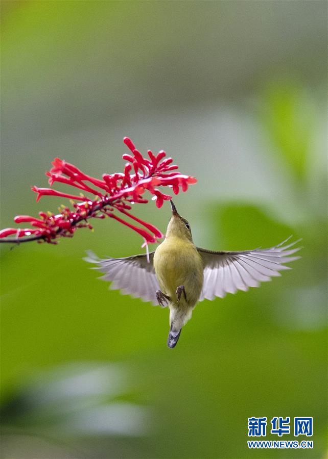 在福州国家森林公园,一只太阳鸟在红苞花枝头“起舞”(11月13日摄)。 新华社记者梅永存摄
