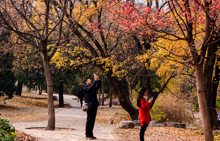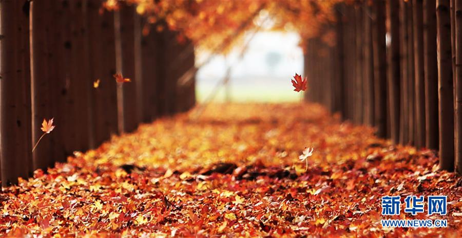 11月14日,在山东省临沂市郯城县郯城街道一处红枫林,片片枫叶无声飘落。 新华社发(张春雷 摄)
