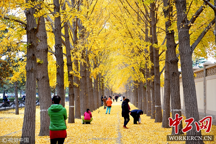 2018年11月15日,初冬的北京,钓鱼台附近,金叶飞舞,道路披“金衣”,市民陶醉在美景之中。