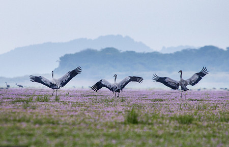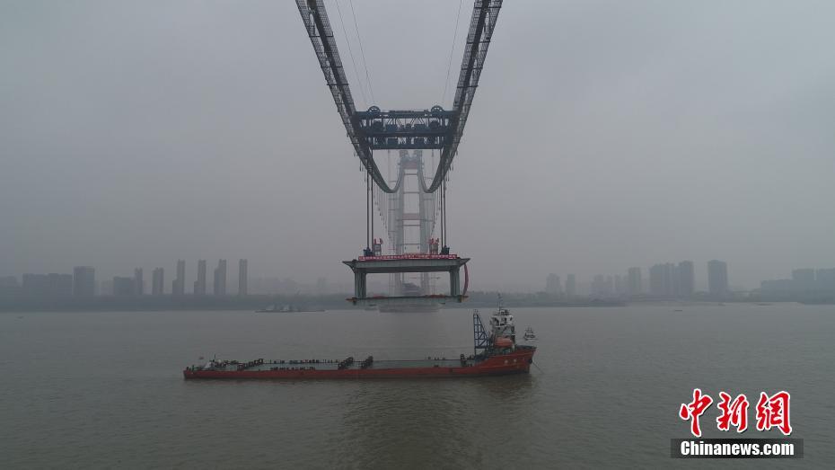 11月15日,随着两台缆载吊机将长36米、宽32.5米、高10米的钢梁,提升至武汉杨泗港长江大桥指定高度,由此拉开这座世界最大跨度双层公路悬索桥的架梁序幕。武汉杨泗港长江大桥是该市范围内第10座长江大桥,也是长江上首座双层公路大桥,位于武汉鹦鹉洲长江大桥与白沙洲长江大桥之间,是世界上功能最全的大桥,包括了机动车道、非机动车道、人行道及人行观光休息区等多种功能设置,该桥预计2019年建成通车。 中新社记者 邱建平 摄