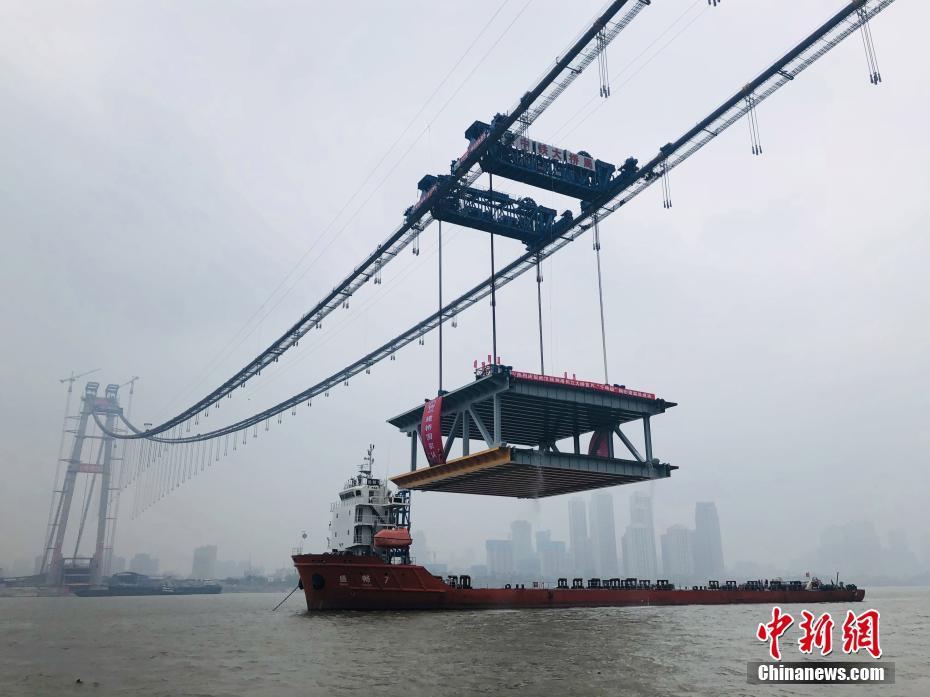 11月15日,随着两台缆载吊机将长36米、宽32.5米、高10米的钢梁,提升至武汉杨泗港长江大桥指定高度,由此拉开这座世界最大跨度双层公路悬索桥的架梁序幕。武汉杨泗港长江大桥是该市范围内第10座长江大桥,也是长江上首座双层公路大桥,位于武汉鹦鹉洲长江大桥与白沙洲长江大桥之间,是世界上功能最全的大桥,包括了机动车道、非机动车道、人行道及人行观光休息区等多种功能设置,该桥预计2019年建成通车。中新社记者 王万健 摄
