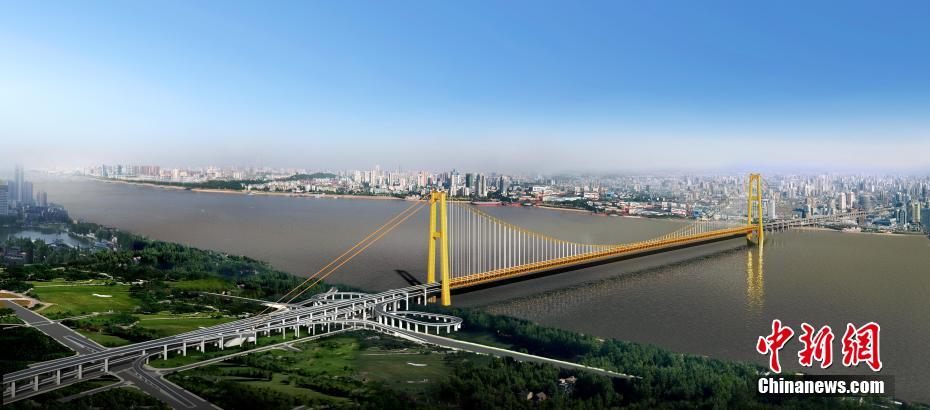 11月15日,随着两台缆载吊机将长36米、宽32.5米、高10米的钢梁,提升至武汉杨泗港长江大桥指定高度,由此拉开这座世界最大跨度双层公路悬索桥的架梁序幕。武汉杨泗港长江大桥是该市范围内第10座长江大桥,也是长江上首座双层公路大桥,位于武汉鹦鹉洲长江大桥与白沙洲长江大桥之间,是世界上功能最全的大桥,包括了机动车道、非机动车道、人行道及人行观光休息区等多种功能设置,该桥预计2019年建成通车。图为该桥效果图。中新社记者 邱建平 摄