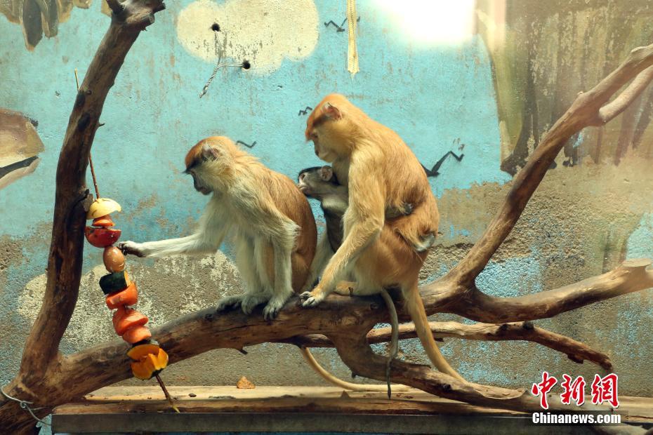 11月15日,赤猴及猴宝好奇的望着“冰糖葫芦”。位于西宁的青藏高原野生动物园为园内127种“居民”丰富食物内容及造型,改善生活环境,添置滑梯等道具,供动物舒适过冬。 中新社记者 马铭言 摄