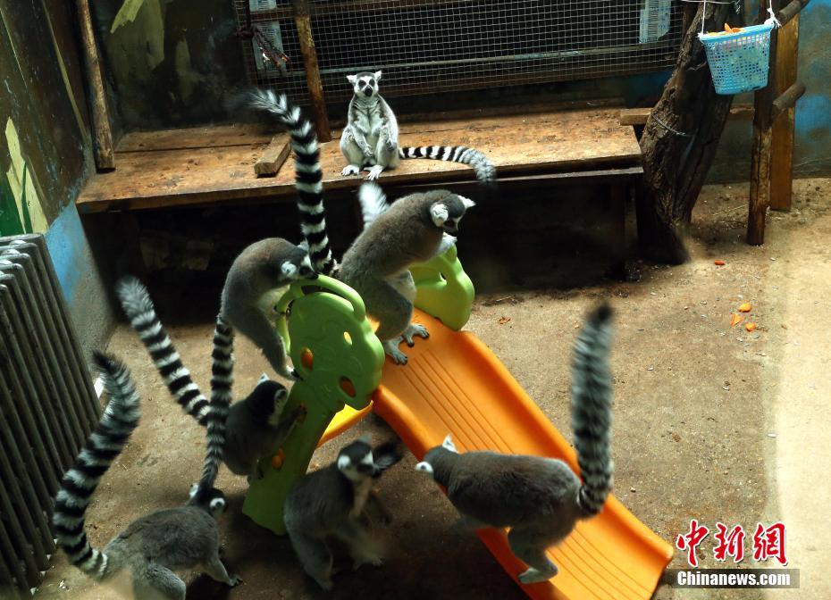 11月15日,马达加斯加环尾狐猴玩滑梯。位于西宁的青藏高原野生动物园为园内127种“居民”丰富食物内容及造型,改善生活环境,添置滑梯等道具,供动物舒适过冬。 中新社记者 马铭言 摄