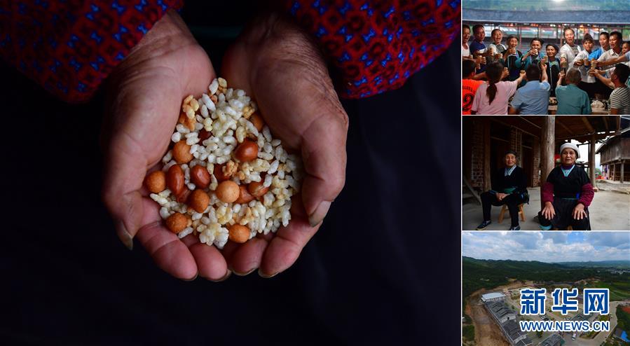 拼版照片:左图为在广西融水双龙沟森林旅游度假区梦呜苗寨,70岁的韦院妈手捧油茶原料:花生、油果、荫米(11月20日摄);右上图为韦院妈(左六)在景区里和游客们一起欢度苗族新禾节(7月18日摄);右中图为韦院妈(右)在家里休息(11月20日摄);右下图为梦呜苗寨(7月19日无人机拍摄)。韦院妈是杆洞乡锦洞村的贫困户,今年3月,她和村里的13户贫困户一起举家搬到双龙沟森林旅游度假区打造的梦呜苗寨,景区将贫困户引入苗寨生活工作,保证贫困家庭有稳定的收入。 广西融水苗族自治县是国家扶贫工作重点县,全县“九山半水半分田”,生活生产环境较为恶劣,脱贫攻坚任务艰巨,目前还有7.68万贫困人口。面对经济发展落后、贫困面广且程度深的现状,当地把脱贫攻坚与创新产业扶持相结合,依托生态资源优势,实施“特色产业富民行动”,通过发展特色民族旅游、林下经济和特色养殖业等扶贫产业,带动贫困群众依靠勤劳的双手,拔穷根摘穷帽,实现脱贫致富。据了解,目前全县贫困户参与特色产业发展的有2.9万户,扶贫产业覆盖率达95%。 新华社记者 黄孝邦 摄