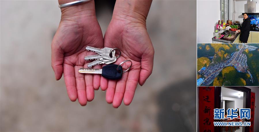 拼版照片:左图为贫困户韦凯婷手捧搬迁安置房的钥匙(11月19日摄);右上图为韦凯婷在搬迁安置房里(11月19日摄);右中为用于安置贫困户的苗家小镇小区(9月30日无人机拍摄);右下图为韦凯婷在搬迁安置房里(11月19日摄)。韦凯婷是融水苗族自治县洞头镇甲朵村的贫困户,今年8月份刚刚搬进位于县城的易地扶贫搬迁工程——苗家小镇小区。 广西融水苗族自治县是国家扶贫工作重点县,全县“九山半水半分田”,生活生产环境较为恶劣,脱贫攻坚任务艰巨,目前还有7.68万贫困人口。面对经济发展落后、贫困面广且程度深的现状,当地把脱贫攻坚与创新产业扶持相结合,依托生态资源优势,实施“特色产业富民行动”,通过发展特色民族旅游、林下经济和特色养殖业等扶贫产业,带动贫困群众依靠勤劳的双手,拔穷根摘穷帽,实现脱贫致富。据了解,目前全县贫困户参与特色产业发展的有2.9万户,扶贫产业覆盖率达95%。 新华社记者 黄孝邦 摄