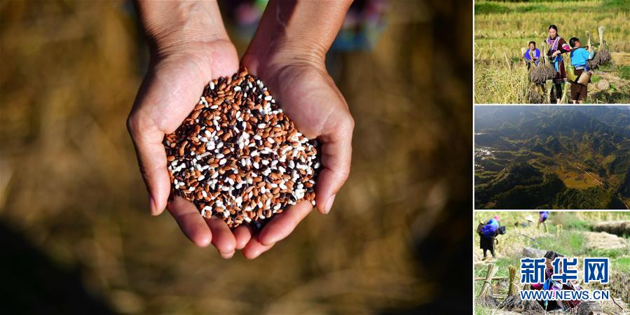 拼版照片:左图为在安太乡元宝村,合作社负责人谢秀萍手捧今年收获的三色香糯;右上图为合作社负责人谢秀萍(中)和社员们在收香糯;右中图为位于苗山深处的香糯种植基地;右下图为谢秀萍在收香糯(照片均摄于10月30日)。谢秀萍是当地香糯种植合作社负责人,带动几百户贫困户种植香糯。香糯是广西融水大苗山的特产,它生长在高寒高海拔的特殊自然环境中,产量少,营养价值高。 广西融水苗族自治县是国家扶贫工作重点县,全县“九山半水半分田”,生活生产环境较为恶劣,脱贫攻坚任务艰巨,目前还有7.68万贫困人口。面对经济发展落后、贫困面广且程度深的现状,当地把脱贫攻坚与创新产业扶持相结合,依托生态资源优势,实施“特色产业富民行动”,通过发展特色民族旅游、林下经济和特色养殖业等扶贫产业,带动贫困群众依靠勤劳的双手,拔穷根摘穷帽,实现脱贫致富。据了解,目前全县贫困户参与特色产业发展的有2.9万户,扶贫产业覆盖率达95%。 新华社记者 黄孝邦 摄