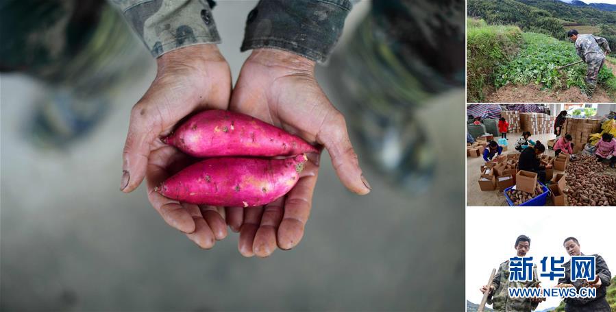 拼版照片:左图为在大浪镇桐里村,55岁的韦炳庄手捧刚刚收获的高山红薯;右上图为韦炳庄在地里挖红薯;右中图为在县城一个电商基地里,工作人员打包贫困户种植的红薯,准备发往全国各地;右下图为韦炳庄(左)在地里挖红薯(照片均摄于11月18日)。今年,韦炳庄种植3亩高山红薯,每亩年产3000多斤,他家已于2016年实现脱贫。 广西融水苗族自治县是国家扶贫工作重点县,全县“九山半水半分田”,生活生产环境较为恶劣,脱贫攻坚任务艰巨,目前还有7.68万贫困人口。面对经济发展落后、贫困面广且程度深的现状,当地把脱贫攻坚与创新产业扶持相结合,依托生态资源优势,实施“特色产业富民行动”,通过发展特色民族旅游、林下经济和特色养殖业等扶贫产业,带动贫困群众依靠勤劳的双手,拔穷根摘穷帽,实现脱贫致富。据了解,目前全县贫困户参与特色产业发展的有2.9万户,扶贫产业覆盖率达95%。 新华社记者 黄孝邦 摄