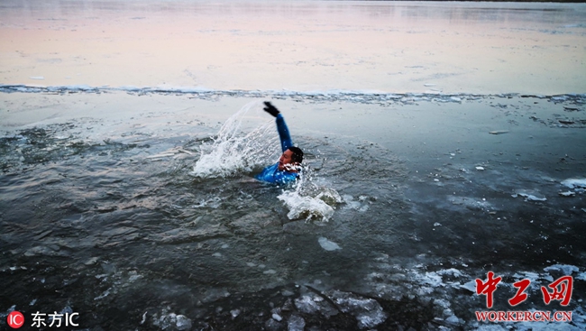 松花江哈尔滨段封江 22日,松花江哈尔滨段今天封江了,由于在封江期间无风无浪江水迅速凝结冰面光滑如镜。记者在道外北十四道街江段看到,冬泳爱好者在冬泳前先用木棒砸开冰面后,才小心翼翼地进入冰水中冬泳。受气温影响,今年松花江哈尔滨段封江比去年晚5天。 (本组图片来源东方IC,请勿转载)